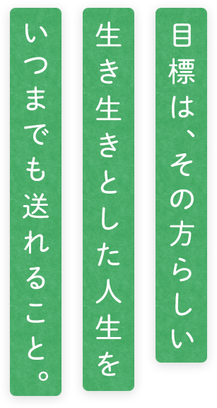 長年に渡る介護実践の中から、ご利用者様の自立・自己実現に向けて八女の里の提案する介護計画など、その方らしい生き生きとした人生をいつまでも送っていただくことを目標とし、その目標に向かって福祉の専門性を実行することで、心にも身体にも活力ある高齢期を八女の里とともに過ごしていただきたいと考えています。