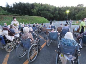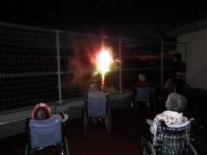 感染対策として、短時間で実施し、ご利用者様には一か所に集っていただかないように、各フロアから花火を見て頂きました。