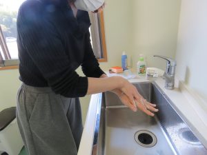 時計を外し肘まで洗う、指輪の裏側まで丁寧に洗う事をして頂けるので利用者様との握手をお勧めします。お互いの手の温もりは会えない時間を埋める大切な心の栄養になるのではないでしょうか・・