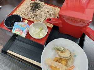 昼食メニューはざるそば、揚げたての天ぷら、そば湯