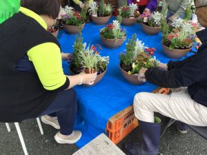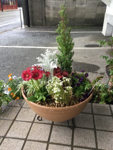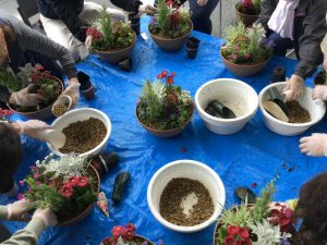 本日はあいにくの雨でしたが、東紺屋町の公民館事業として花の寄せ植え講座に参加しました。